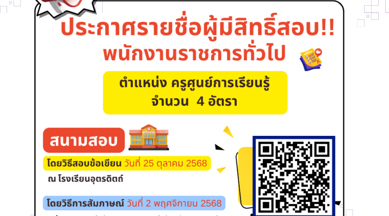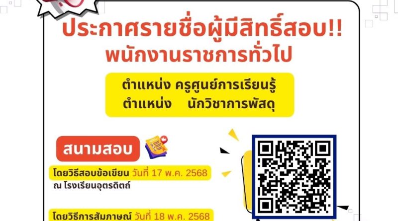 Read Moreแจ้งการเปลี่ยนแปลงแผนผังสนามสอบ โดยวิธีสอบข้อเขียน ตำแหน่งพนักงานราชการทั่วไป [ครูศูนย์การเรียนรู้]และ[นักวิชาการพัสดุ] ในวันที่ 17 พฤษภาคม 2568 ณ โรงเรียนอุตรดิตถ์