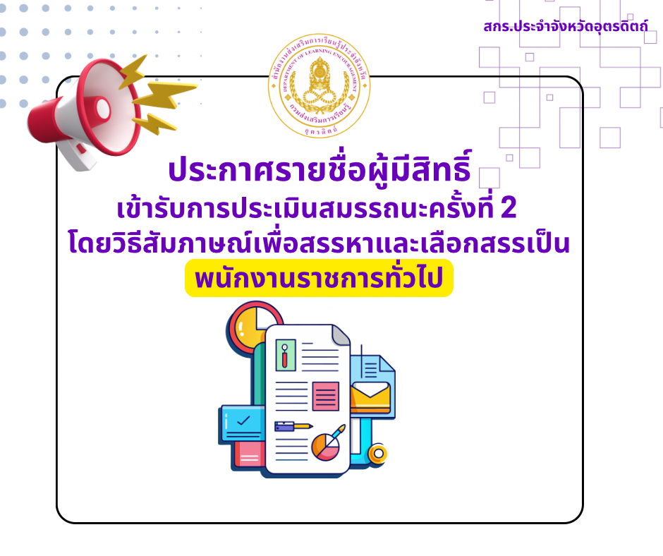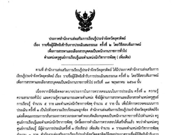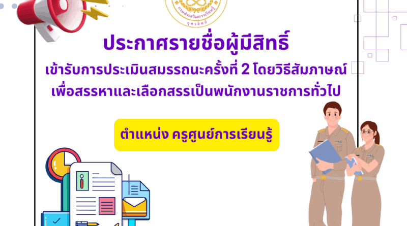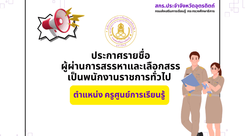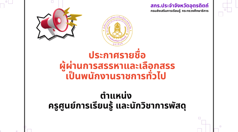 ประกาศเรื่องบัญชีรายชื่อผู้ผ่านการสรรหาและเลือกสรรเป็นพนักงานราชการทั่วไป ตำแหน่ง ครูศูนย์การเรียนรู้