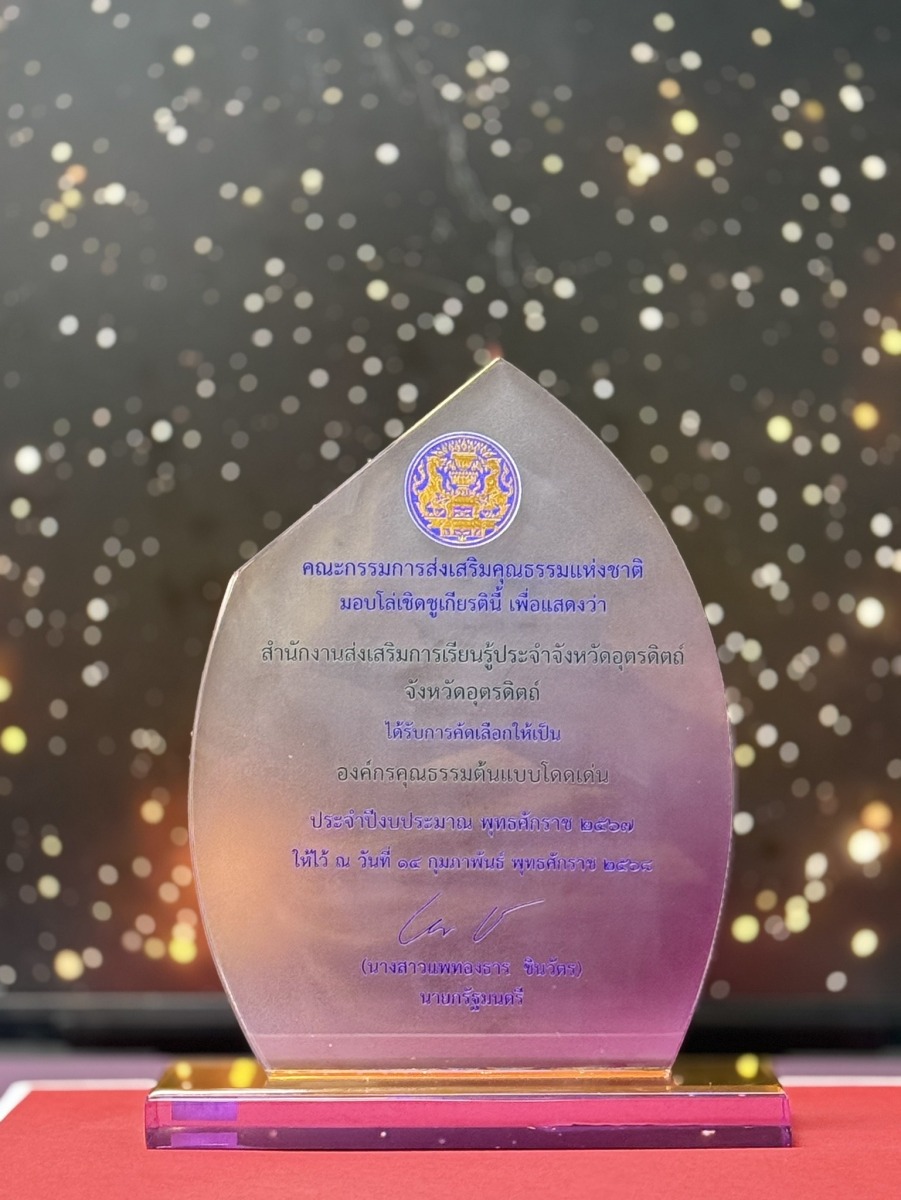 นายสมัย แสงใส ผู้อำนวยการ สำนักงาน สกร.ประจำจังหวัดอุตรดิตถ์ เข้ารับโล่เชิดชูเกียรติ องค์กรคุณธรรมต้นแบบโดดเด่น ประจำปีงบประมาณ พ.ศ. 2567 จาก นางสาวสุดาวรรณ หวังศุภกิจโกศล รัฐมนตรีว่าการกระทรวงวัฒนธรรม ประธานในพิธี จัดโดยกรมการศาสนา ซึ่งถือเป็นรางวัลอันทรงเกียรติ ที่มอบให้แก่หน่วยงานที่มีการขับเคลื่อนคุณธรรมในองค์กรอย่างเป็นระบบและยั่งยืน ณ อาคารอเนกประสงค์ ศูนย์วัฒนธรรมแห่งประเทศไทย กระทรวงวัฒนธรรม