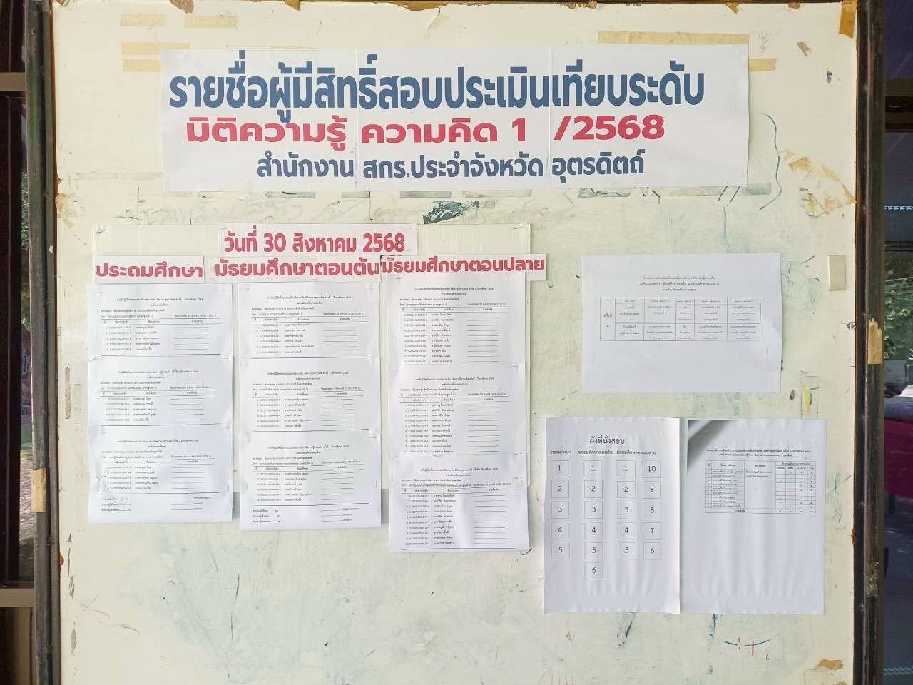 นายสมัย แสงใส ผู้อำนวยการ สำนักงาน สกร.ประจำจังหวัดอุตรดิตถ์ มอบหมายให้ นางพัทธนันท์ ด่อนดี รองผู้อำนวยการสำนักงาน สกร.ประจำจังหวัดอุตรดิตถ์ พร้อมด้วยผู้บริหารสถานศึกษา นิเทศ ตรวจเยี่ยมสนามสอบการประเมินเทียบระดับการศึกษา มิติความรู้ ความคิด ครั้งที่ 1 ปีการศึกษา 2568 ระหว่างวันที่ 30-31 สิงหาคม 2568 เพื่อตรวจสอบความเรียบร้อยในการจัดสอบเทียบระดับฯ และให้กำลังใจแก่ผู้เข้าสอบ ณ สนามสอบห้องประชุม สำนักงาน สกร.ประจำจังหวัดอุตรดิตถ์